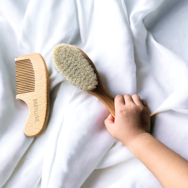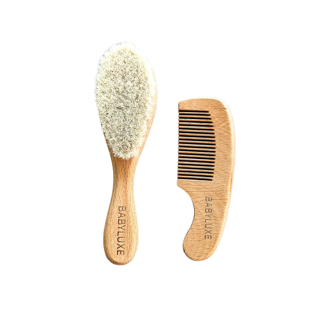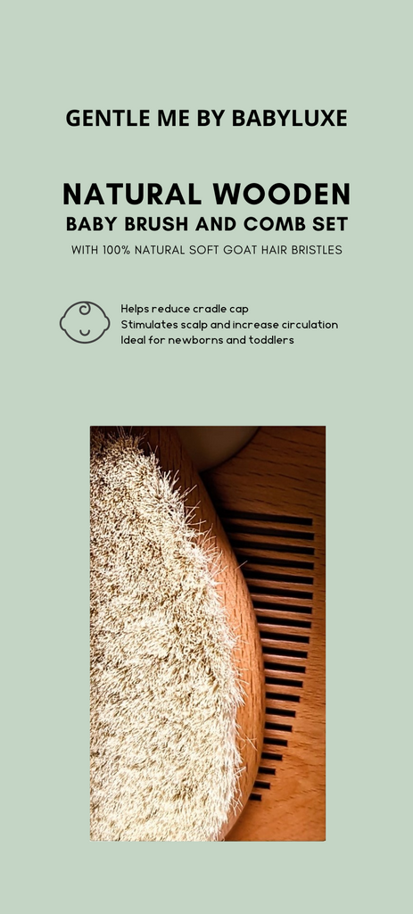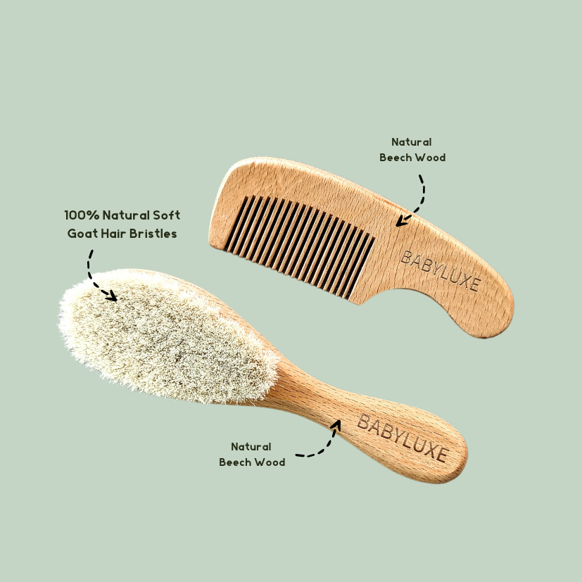 Designed to care for baby hair. This set includes 1 x Natural Goat Hair Bristle Brush & 1 x Natural Wooden Comb.